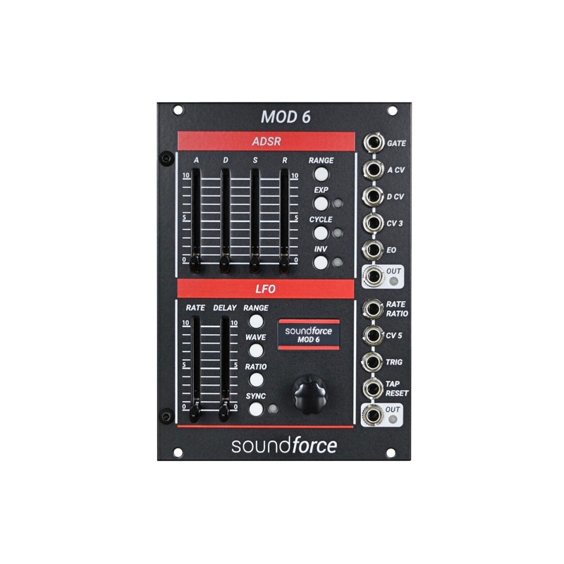 The Soundforce MOD 6 is a powerful dual-function Eurorack modulation source designed and developed to compliment the other modules in the juno-themed range of modules: DCO, VCF/VCA 6 and CHORUS 6.It is based on experiences with the Dual LFO and Dual ADSR m