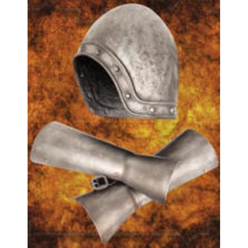 The helmet is made of lightweight, soft polyurethane and painted to resemble antique steel, while the two vambraces are vacu-formed plastic with real leather straps and painted to match.