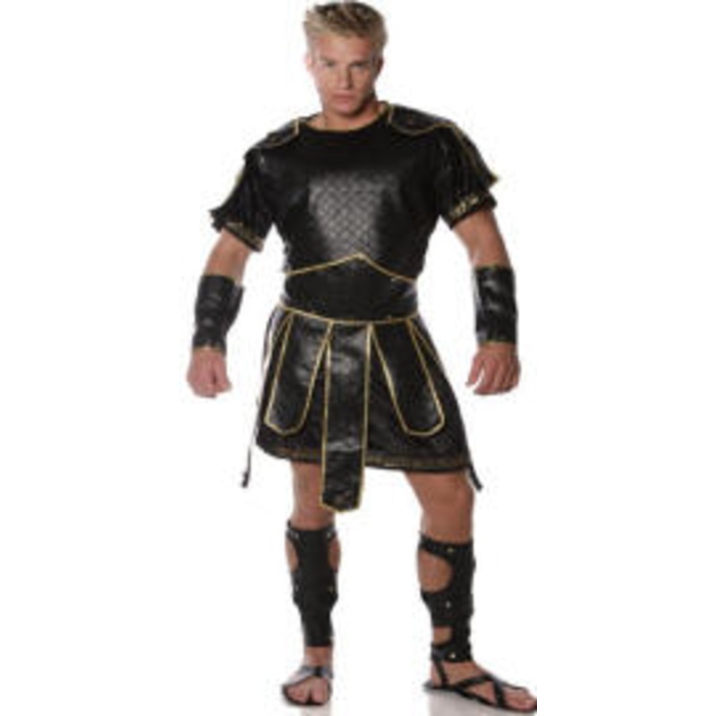 Includes: Textured black faux leather tunic accented with matching Spartan belt, arm cuffs, studded leg wraps & black velvet toga all with gold metallic trim.