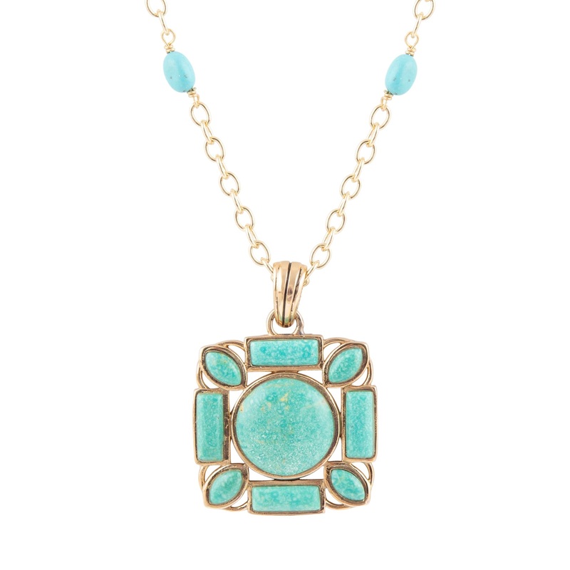 Elevate your style with our Squared Up Green Turquoise Pendant Necklace! Crafted by hand, this unique piece features genuine green turquoise stones in high polish bronze bezels, complete with a golden bronze chain. Adjustable up to 29″, this 1.3″ pendant adds a touch of elegance and weighs only 29 grams.