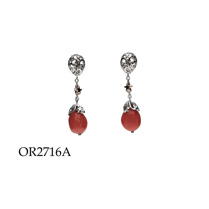Earrings in silver and 9kt rose gold with coral barrels