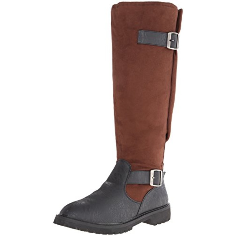 Brown Microfiber (Imitation Suede) and Black Distressed Polyurethane (PU) Knee High Pull on Boot with Expandable Shaft, Fabric Lining, Padded Foot Insert, Rubber Sole and 1.5" Heel.Color: Brown/Black (shown)Size: S (8-9), M (10-11), L (12-13), XL (14)100%