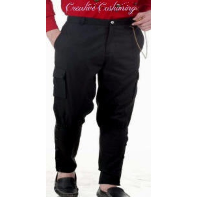 Steampunk Airship Pants BlackInspired by Jodhpur pants, these 100% cotton fabric (canvas) trousers have flared upper legs and hips with fitted lower legs. The closure around calves has buttons. One of the belt loop has D-ring for attaching all sorts of gad