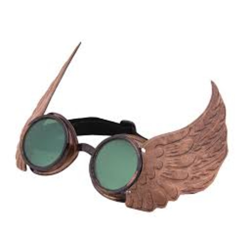 Featuring embossed feathery wings made from distressed leather-look material, an antiqued coppery gold finish and flashy vintage green lenses, youll be ready to take to the skies in these Steampunk Winged Goggles