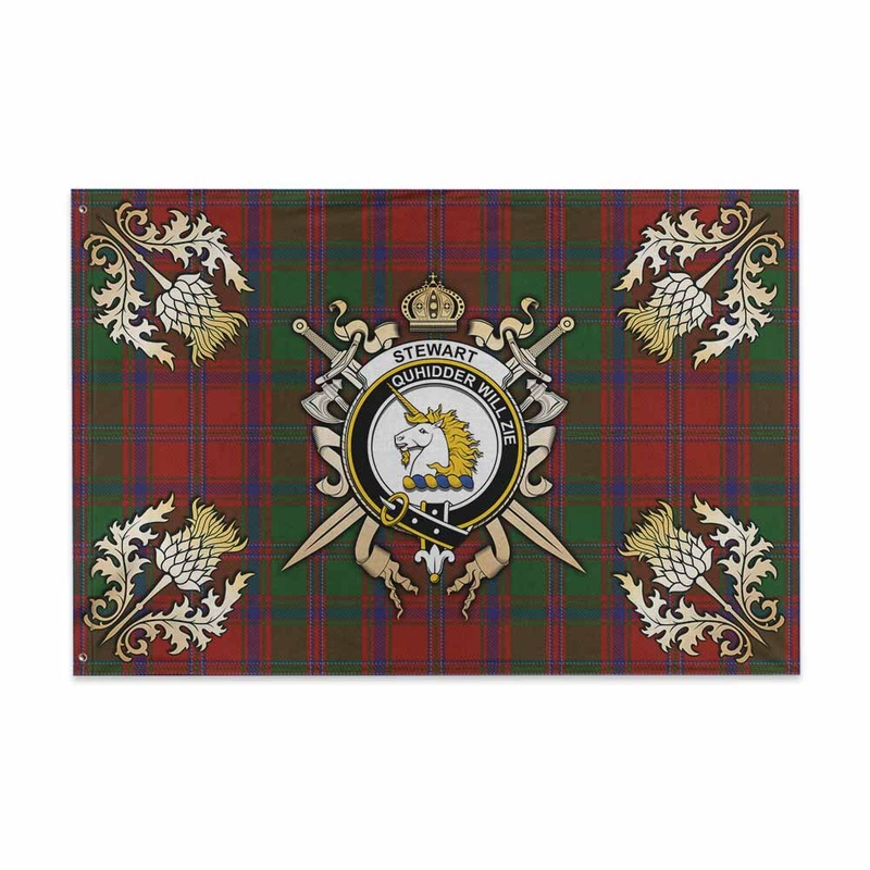 Stewart (Stuart) of Appin Tartan House Flag with Family Crest and Golden Thistle Crossed Sword Design