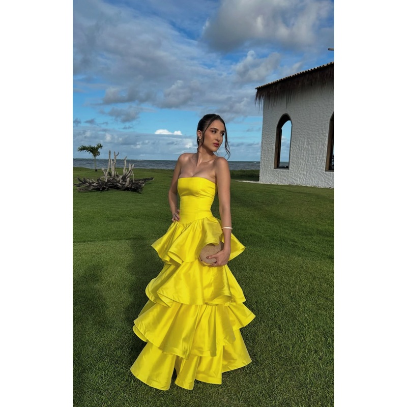 Strapless A Line Yellow Prom Dress Tiered Wedding Dress J7316