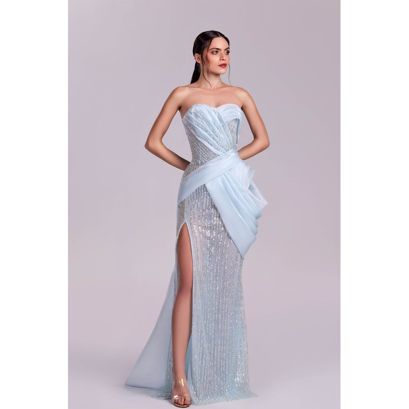 Light blue strapless dress features sweetheart neckline, a lace bodice with sequin embellishments, and a floor-length skirt with a thigh-high slit. An asymmetrical organza overlay wraps around the waist, suitable for special occasions.