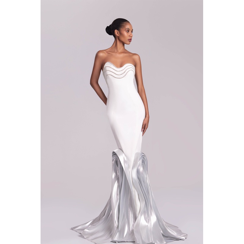 White strapless dress with crystal embellishments and a form-fitting silhouette. The mermaid skirt has metallic silver ruffles, and the back is adorned with crystal lines. Perfect for formal events.