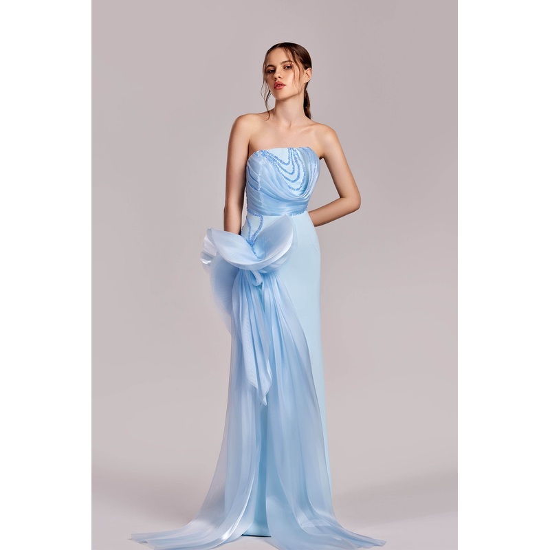 Blue fitted bodice dress with crystal trims and a strapless design. Organza details at the waist flow into a mermaid-style skirt, adding movement to the look.