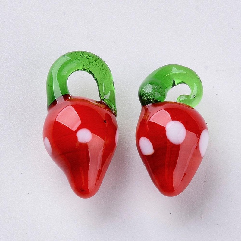 A red and green glass strawberry pendant, to hang from your hoop earrings, necklaces and other accessories or jewelry Handcrafted Dimensions: Length 19-21mm Width: 9-11mm thickness: 10-11mm Ring: 2.5-4mm A lovely pendant to use for your fruit and summer th