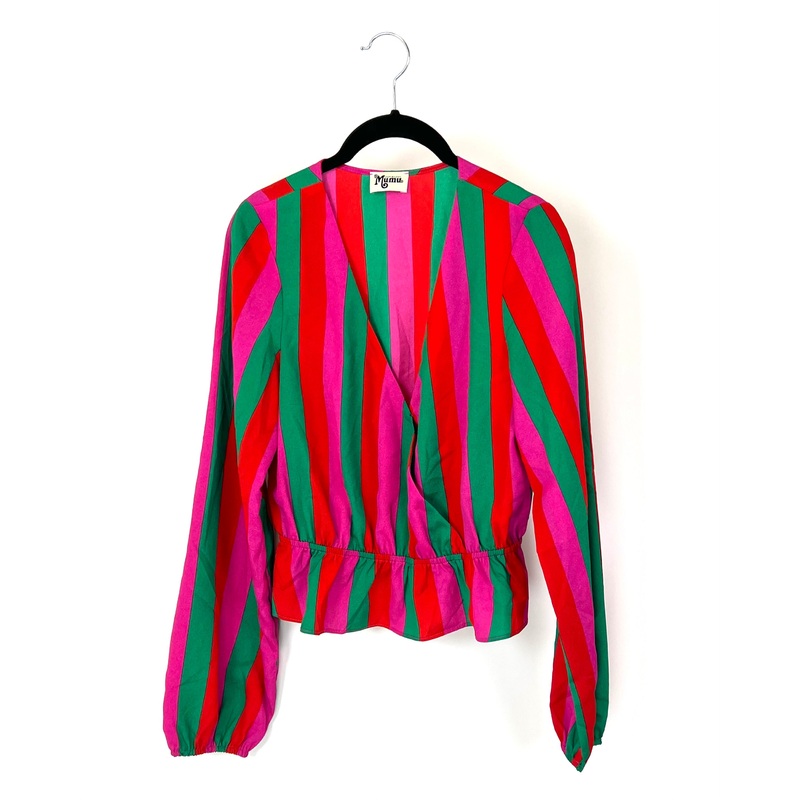 Brand new - donated from the designerShow Me Your Mumu hot pink, green, and red striped long sleeve peplum blouse with a deep v-neckline, and elastic wrist cuffs.Estimated size small (size 0-2)Estimated Original Retail Price: $138.00*This is a sample piece