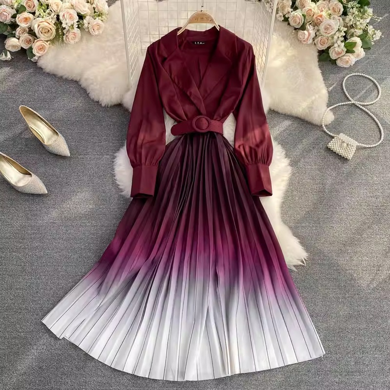 Suit Collar Gradient A Line Elegant Pleated Dress 1569