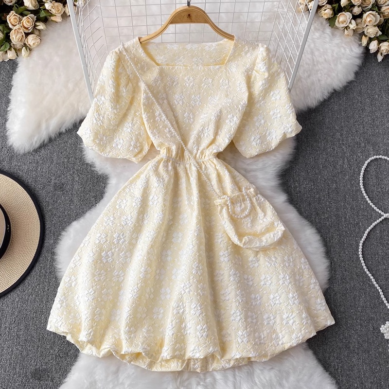 Summer French Retro Puff Sleeve Short Skirt Square Neck Fluffy Princess Dress 904