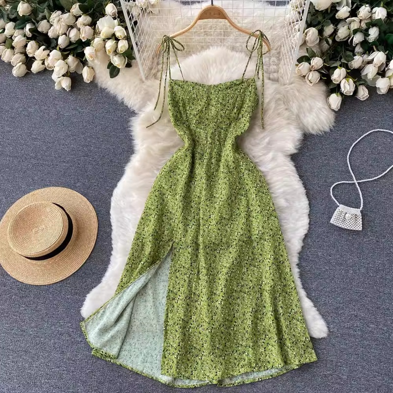 Be the first to review “Summer Green Floral Sling Dress Zipper Back Dress with Slit 1115”