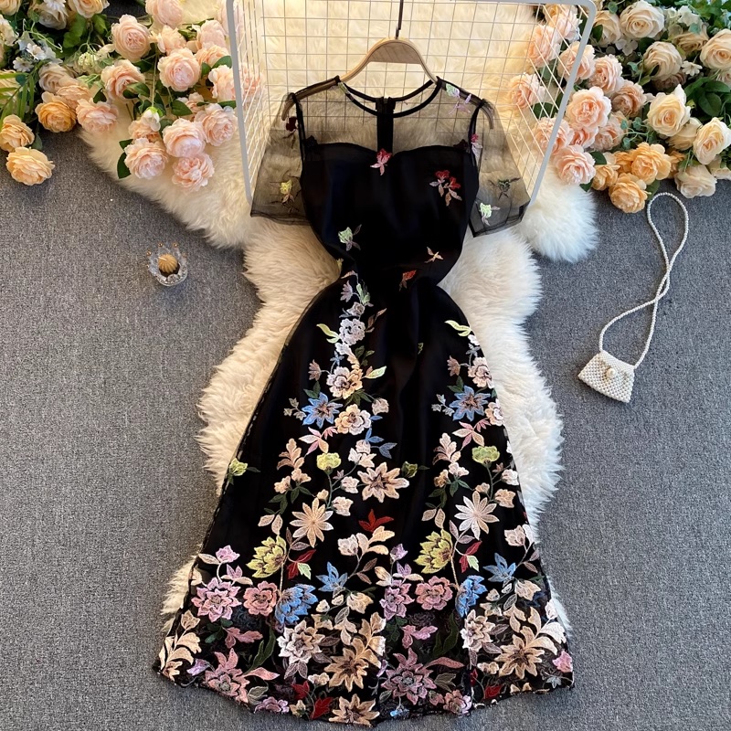 Summer Mesh Embroidered Retro Long Dress Printed Large Swing Dress 1168