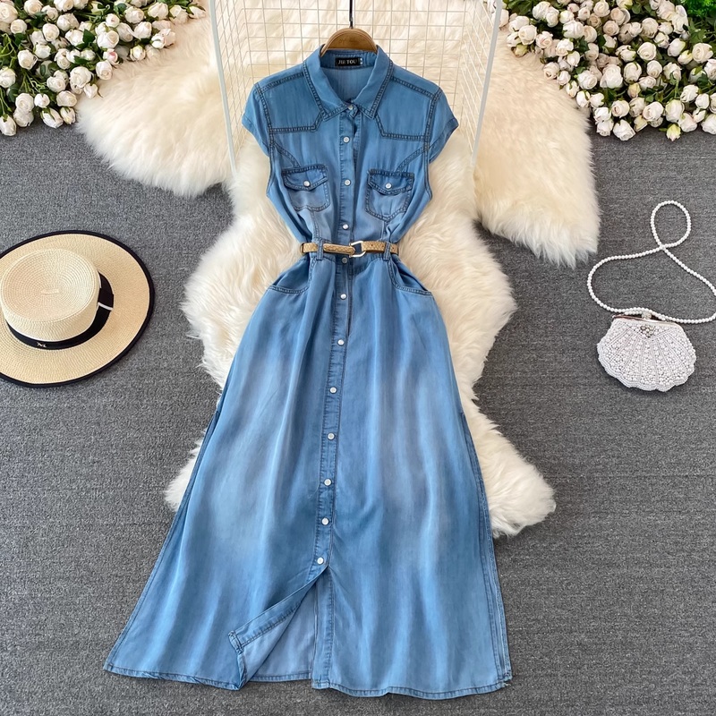 Summer Retro Sleeveless Denim Dress A Line Shirt Long Skirt 1459