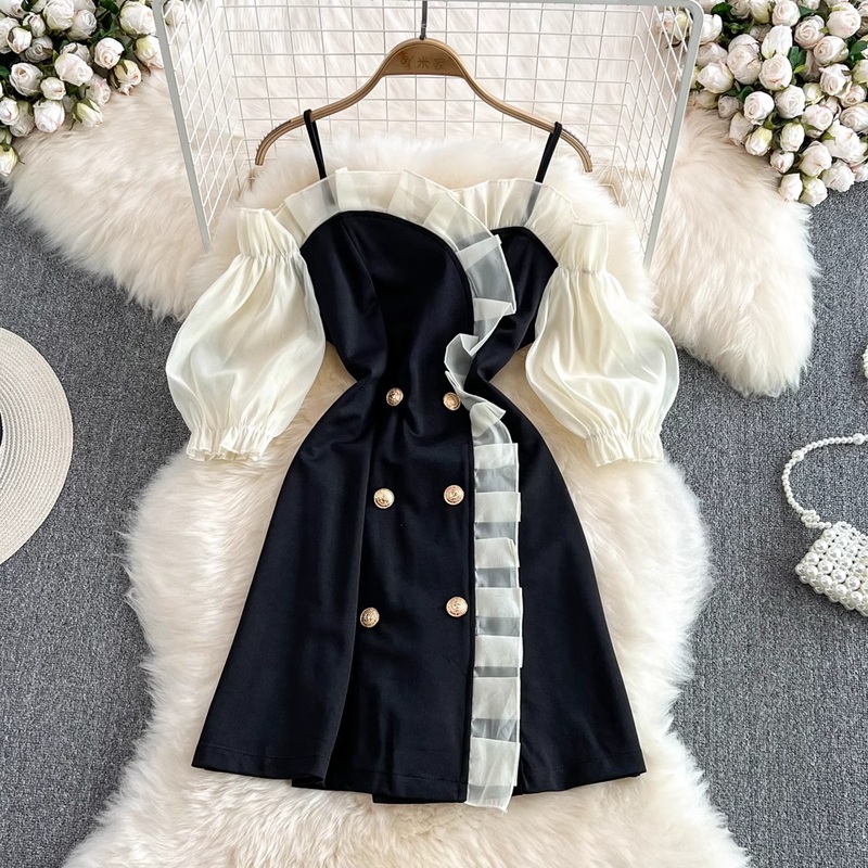 Product NO. :1561Size: S M L XLCollar type: V neckWaist type: high waistColour: Blacksleeve length: short sleeveSkirt length: mid-length skirtSize details(cm):SBust86Waist74Full length83MBust90Waist78Full length84LBust94 Waist82Full length85XLBust98 Waist8