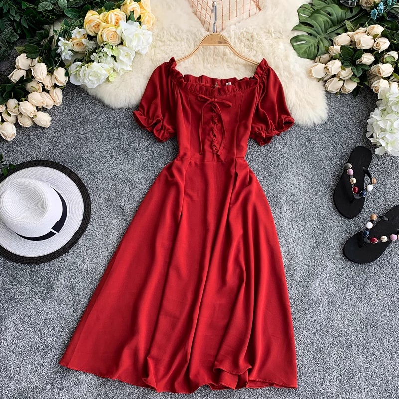 Summer Ruffled Dress Bubble Sleeves Retro Skirt 1201