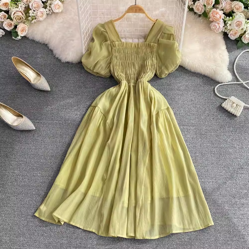 Product NO. :1605Size: S M LCollar type: square collarWaist type: high waistColor: Green , Apricotsleeve length: short sleeveSkirt length: mid-length skirtSize details(cm):SBust84-88Full length105MBust90-94Full length106LBust96-98 Full length107