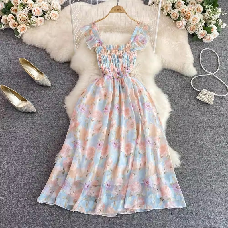 Summer Sweet Floral Print A Line Elegant Suspender Skirt 1586