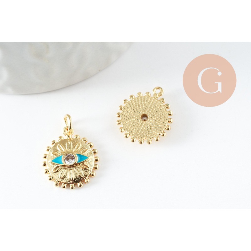 Sun medal pendant with blue enamel eye, 18K gold-plated brass and zircon crystal, lucky brass pendant for jewelry creation, 17mm, x1 (G5278)