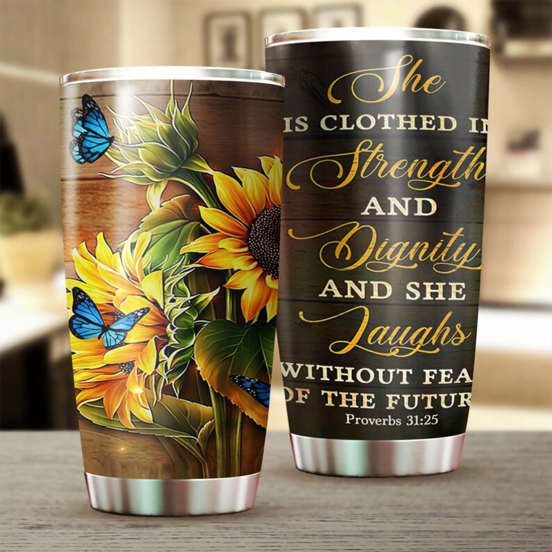Sunflower She Clothed In Strength Tumbler-Sunflower Present-Butterfly Lover Gift-Gift for her-daughter gift-mom gift-cool gift womenGift of Love: A meaningful gift for your friends, family members, wife/husband, bridesmaid/groomsmen, coworkers on birthdays
