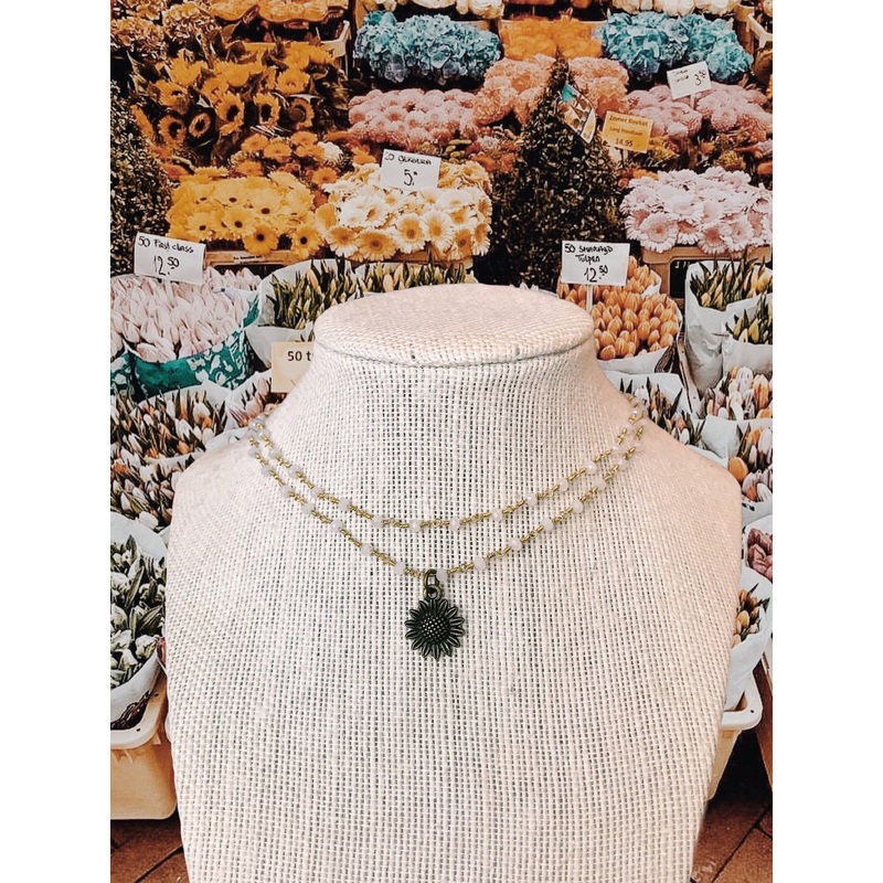 handmade dainty white beaded double wrap choker w/ sunflower charm size guide: 28 (wraps around twice)