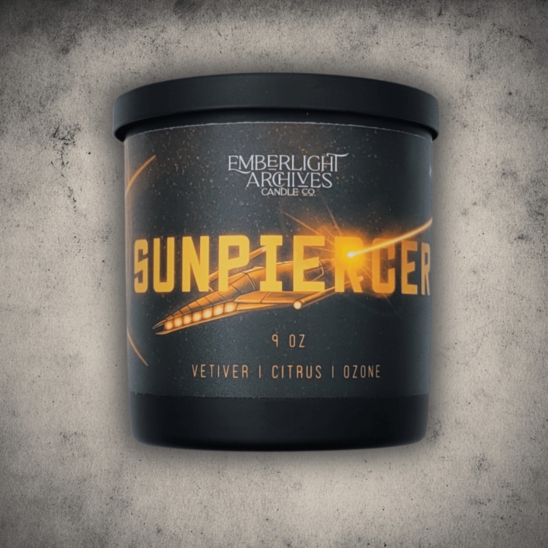 Inspired by countless stories that feature rogue ships cutting through the vast expanse of space, Sunpiercer reflects its name with a bright, citrus scent over a deeper layer of metal and ozone, perfect for those who love clean, invigorating citron notes in a candle.