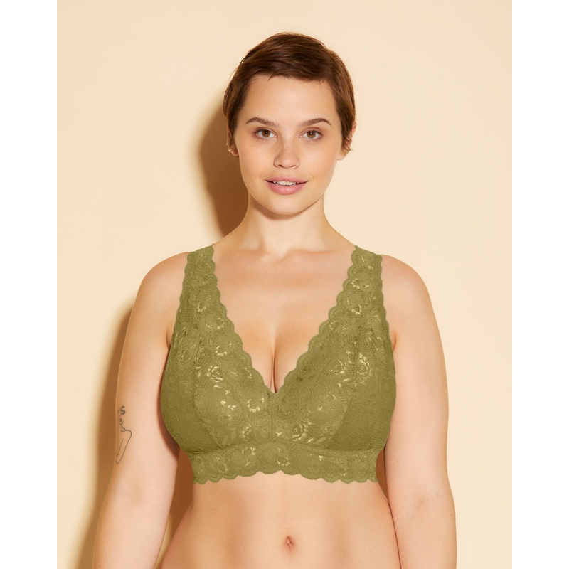 Longline plunge front wireless bralette designed for those with fuller busts paired with smaller bands.Soft, stretch, semi-sheer, scalloped lace.Longline band and power mesh lining add support.Non-padded cups with plunge front neckline.Wide, adjustable str