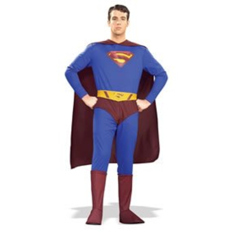 Includes: Jumpsuit with built in muscle chest, attached boot covers, cape and belt.