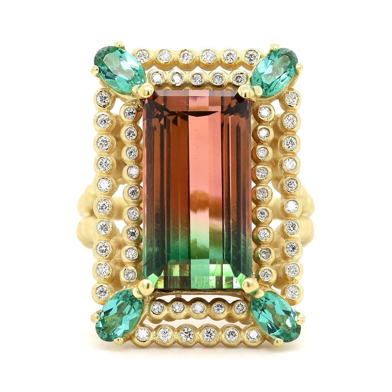 Suzy Landa 18K Yellow Gold Emerald Cut Watermelon Tourmaline and Diamond Ring