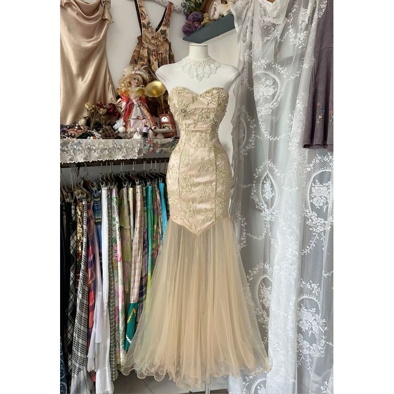 Sweetheart Mermaid Champagne Prom Dress Applique Evening Dress J6741