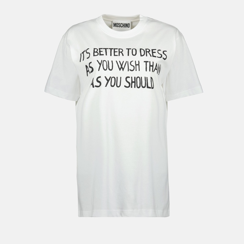 T-shirt Archive Slogan blanc de Moschino pour femme de la collection Printemps-t 2025. Ce t-shirt en coton prsente un col rond, des manches courtes et un imprim slogan sur le devant.