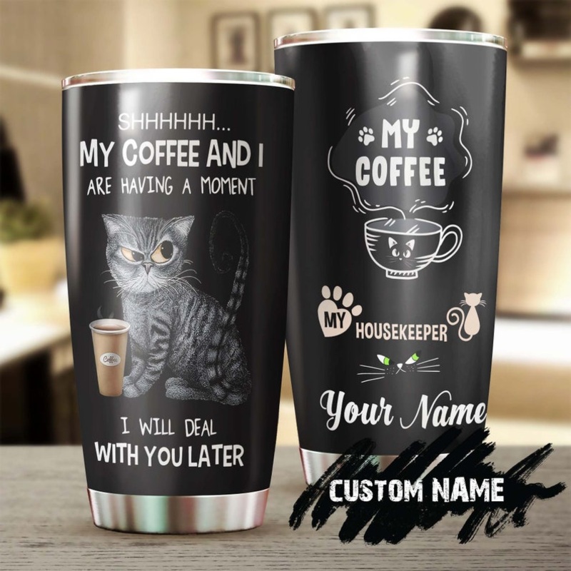 Tabby Cat House Keeper Having Coffee Personalized Tumbler-Cat Tumbler- gift for cat mom cat dad- gift for cat lover-cat day giftGift of Love: A meaningful gift for your friends, family members, wife/husband, bridesmaid/groomsmen, coworkers on birthdays, Mo