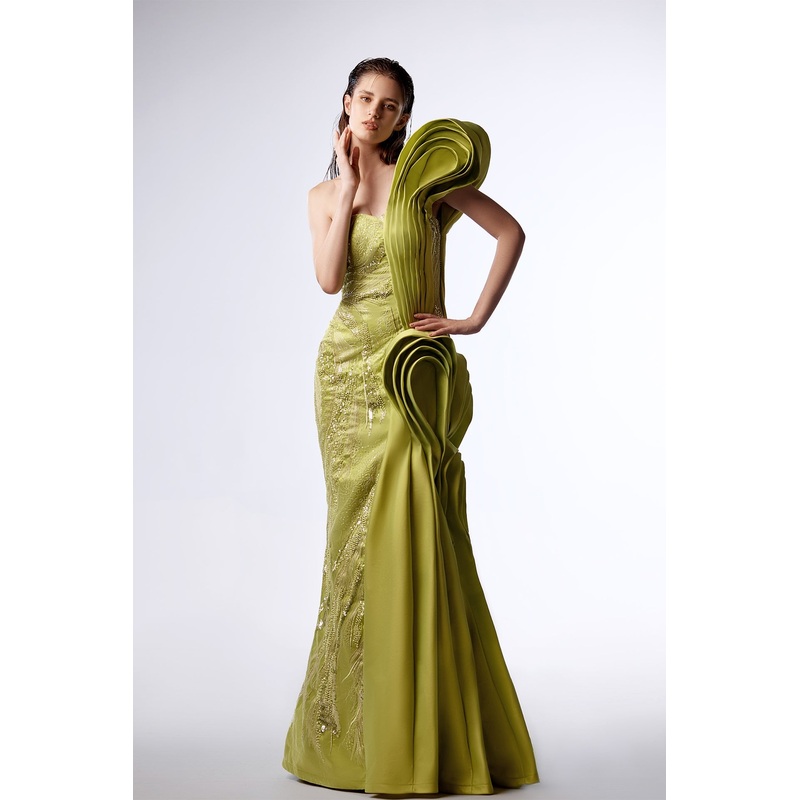 Lime green one-shoulder taffeta mermaid dress. Featuring a ruffled sleeve, and a fitted bodice. Complemented with a mermaid skirt with a ruffle on the side of the hip and cascades down to the floor. The dress is adorned with lace embroidery.
