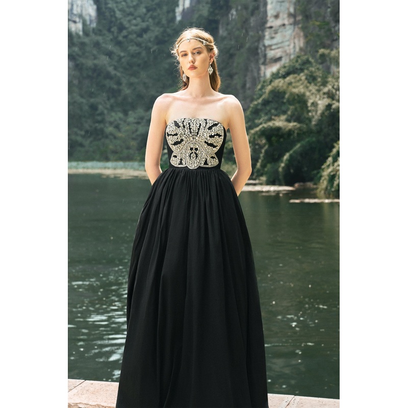Black lustra sheer taffeta strapless dress. Featuring a straight neckline, and a fitted bodice fully embroidered with crystals is a floral shape. Complemented with a gathered waist, and a flared voluminous A-line skirt.