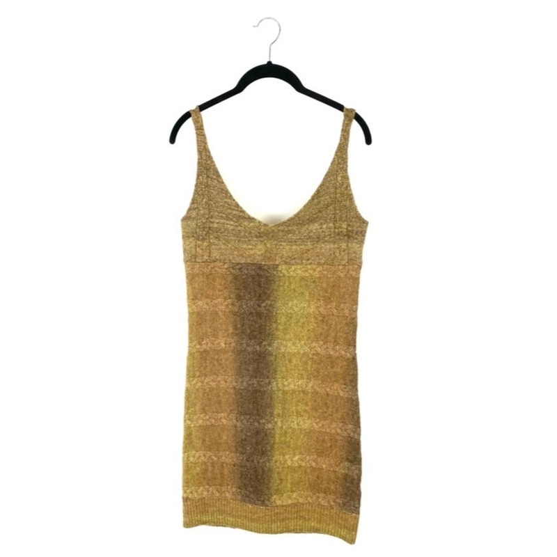The Snooki Shop sleeveless, soft, stretchy, yellow-beige, tan, orange, and brown knit sweater dress with knit detailing.