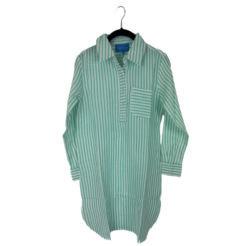 Brand new - donated from the designerAlice Walk teal and white striped shift dress with a button up and collar neckline, long sleeves and front chest pocket in a straight fit silhouette and lightweight and semi sheer fabricSize Extra Small (Size 0-2)Approx