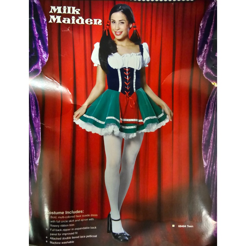 California Costumes Milk MaidenCostumeIncludes: Bold multi - colored faux suede dress with full circle skirt, flowery ribbon trim apron, full back zipper in expandable back panel for improved fit & attached doubletiered lace petticoat.Machine WashableColor