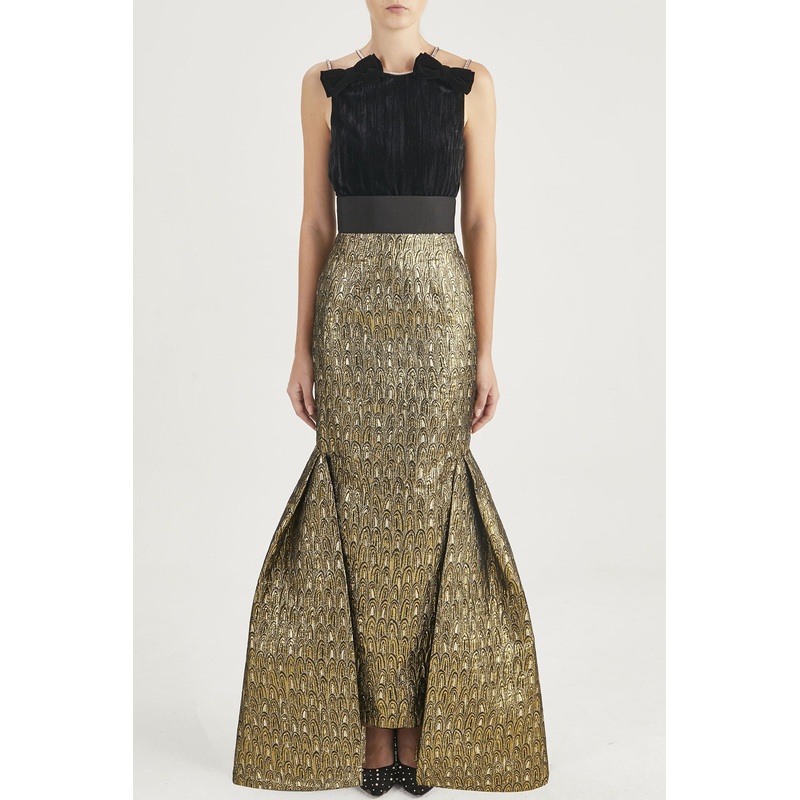 Textured velvet top features two tuxedo velvet bows at the neckline, rose-gold chain straps, and a semi-fitted design.Floor-length mermaid skirt in golden fan-shaped brocade features a pleated overlay, a grosgrain waistband, and a slit at the back.