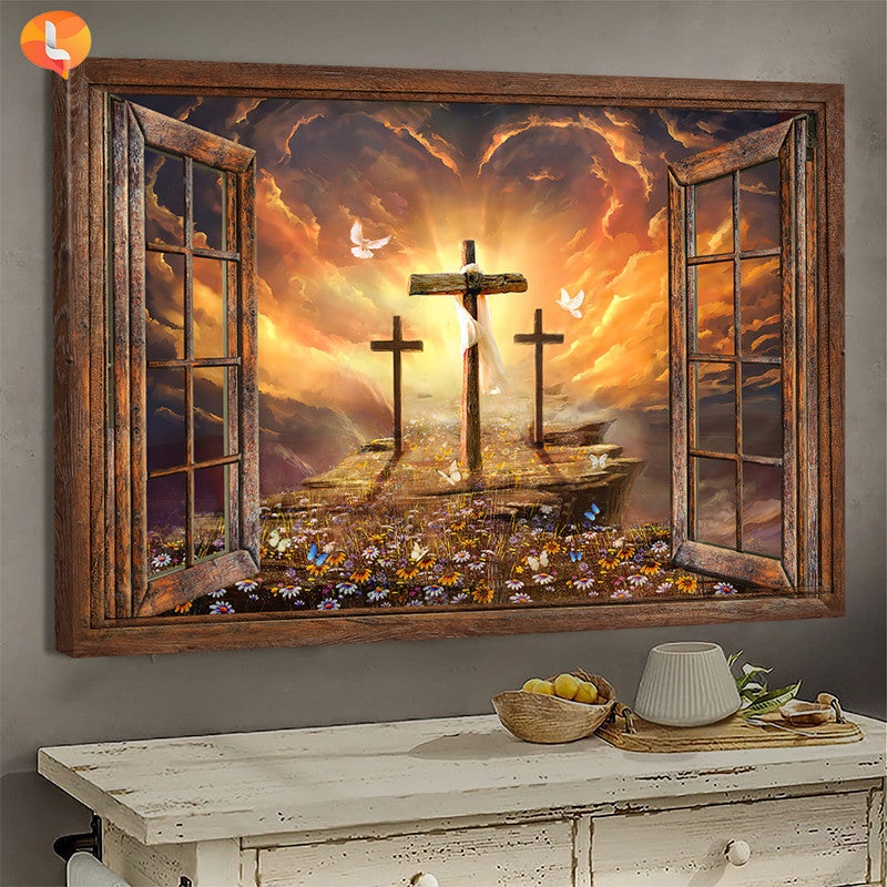 The Three Crosses Gallery, Wrapped Path to heaven window frame, Jesus Landscape Canvas Prints, Christian Gift Canvas
