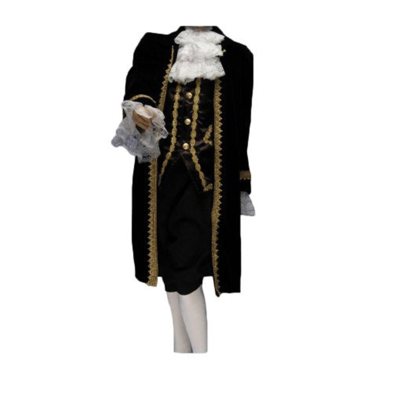 Includes: Finely detailed long Black velvet jacket, vest and knickers, separate white lace jabot and sleeve cuffs.Child Size: M (8-10), L (12-14), XL (16-18)Colors: Black (shown)Made in the U.S.A. / High-quality fabric / Hat and wig sold separatelyIf you e