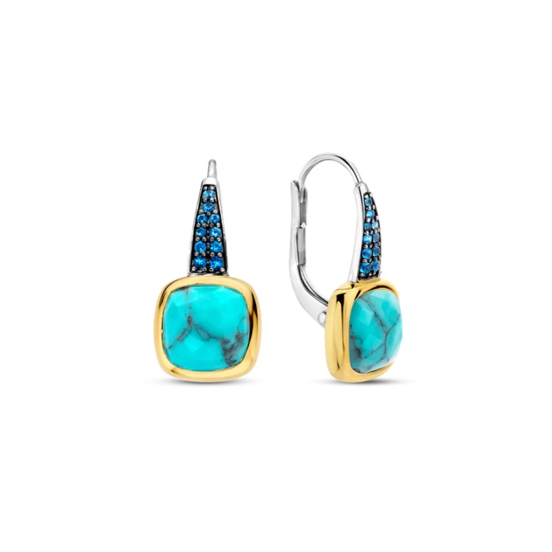 Questi orecchini placcati oro TI SENTO 7969TQ sono caratterizzati da una vibrante pietra turchese a forma di cuscino incastonata in una radiosa montatura placcata oro giallo. Una miscela armoniosa di geometria elegante e colori vivaci. La forma originale a