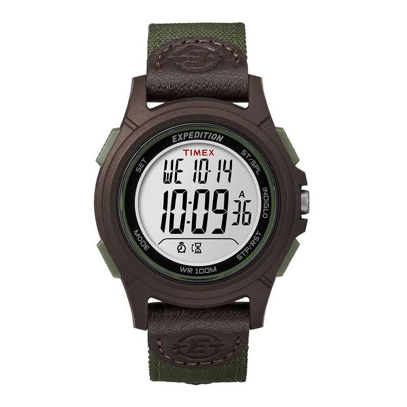 We know what it takes to make your favorite digital watch. 100 meter water resistant, easy-to-set alarms and timers and a comfortable mixed nylon and leather strap.GlassMineralCase MaterialPlastic/RubberCase ColorBrown and GreenStrap MaterialNylon/LeatherM