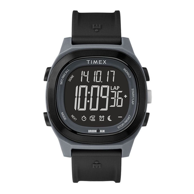 Weve created a stylish everyday watch to match your active lifestyle. The Ironman Transit collection has a comfortable, athletic silhouette with a dark gray case, metallic blue top ring and blue resin strap for a modern-retro look. Features include a countdown timer, sports stopwatch, customizable alarm and is water resistant up to 100 meters.