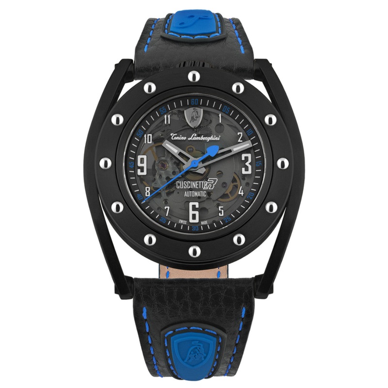 Skeleton dial with smoked sapphire crystal and luminous stainless steel hands and markers. Blue details. Tonino Lamborghini Shield at 12pm.