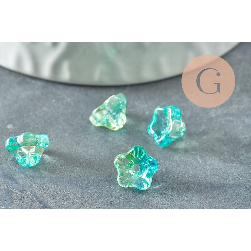 Transparent blue green glass flower beads 8.5mm, Czech glass beads, flower beads, x10 (G9836)