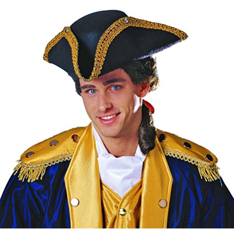 George Washington Black Tricorn Hat (3-Cornered)Color: Black with ruffled gold trim.One size fits most Adults.100% PolyesterUnisex hat with side snaps. /Imported /Hand WashFRA28342