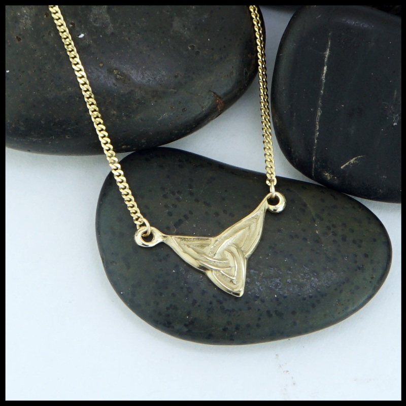 This simple, yet stunning trinity knot pendant in 14K Yellow Gold is attached to an 18″ light curb gold chain.