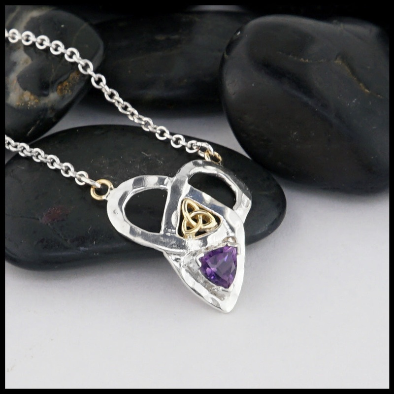 This pendant has a Sterling Silver frame with an 18K Yellow Gold trinity knot in the center. Pendant is set with an Amethyst.This pendant comeswith an attached 16" Sterling Silver cable chain.Original designs Stephen WalkerPlease call or email for more inf